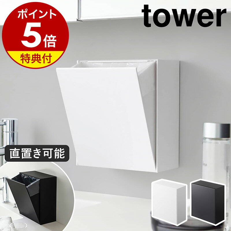 特典付き[ ウォールダストボックス&収納ケース タワー ]山崎実業 tower ゴミ箱 フラップ式 収納 貼って剥がせる 隠せる 小物入れ 壁面 ケース フック 角型 ゴミ箱 壁 小型 北欧 シンプル おしゃれ モノトーン yamazaki ブラック ホワイト 5433 5434【送料無料】 公式