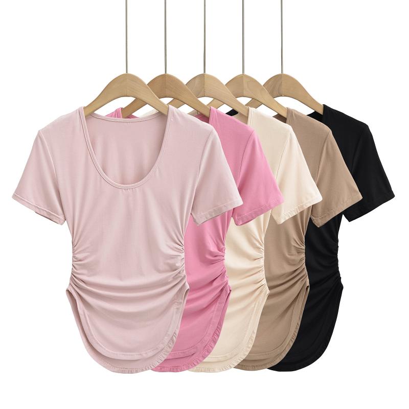 ["・カテゴリ: Tシャツ・スタイル: エレガントカジュアル・主な素材: ポリエステル 70-80%・ネックライン: Uネック・袖丈: 半袖・袖タイプ: レギュラー・カラー展開: ブラック、ココアブラウン、ローズピンク、ミルクオレンジアプリコット、サクラライトピンク・サイズ展開: S、M、L",""]