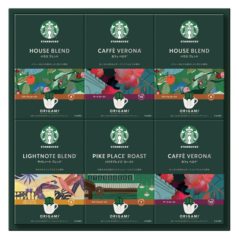一杯分の美味しさを味わえるドリップタイプのスターバックスオリガミ。一杯分の美味しさを味わえるドリップタイプのスターバックスオリガミ。■セット内容/ハウスブレンド(9g×4p)×2、パイクプレイスロースト・ライトノートブレンド・カフェベロナ(各9g×4p)×各1 ■箱サイズ/16.4×50.2×8.7cm ■賞味期間/常温10ヶ月 ■箱入重量/0.7kg一杯分の美味しさを味わえるドリップタイプのスターバックスオリガミ。一杯分の美味しさを味わえるドリップタイプのスターバックスオリガミ。■セット内容/ハウスブレンド(9g×4p)×2、パイクプレイスロースト・ライトノートブレンド・カフェベロナ(各9g×4p)×各1 ■箱サイズ/16.4×50.2×8.7cm ■賞味期間/常温10ヶ月 ■箱入重量/0.7kg