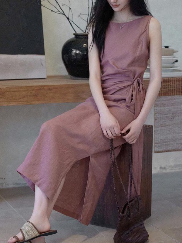 レディース ワンピース リネン100% クルーネック ノースリーブ ウエストリボン ウエストマーク ロング丈 上品 きれいめ 通勤 オフィス ナチュラル スタイルアップ 着回し 春 夏