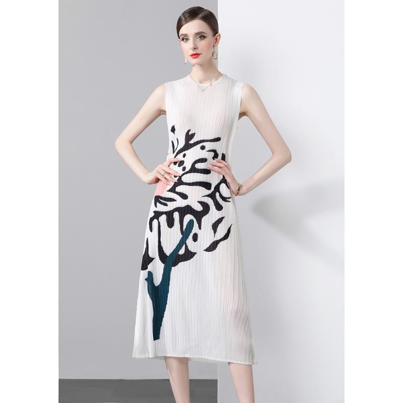 ワンピース レディース プリーツ加工 シフォン素材 丸首 クルーネック ノースリーブ プルオーバー プリント ストレート ロング丈 フリーサイズ 春夏 カジュアル 大人おしゃれ