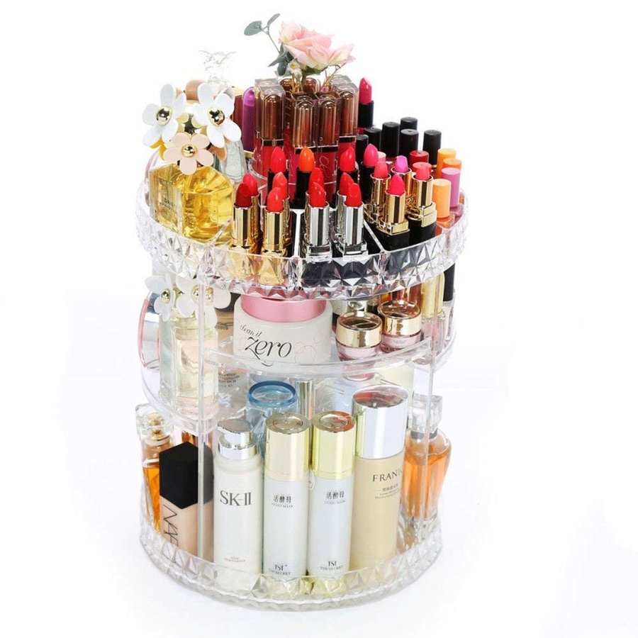 大容量コスメボックス 化粧品からアクセサリーまで収納できる。 360°回転なので取り出しやすい。透明なので置いている場所が一目瞭然! 散らかりがちなマニュキア、リップ、アクセサリーなどを全て整理整頓できます。 耐荷重が50kgなので、どんなに入れてもスムーズに回転します。 6段階の高さ調整ができるので、入れるものに合わせてお好きな高さにできます。 サイズ 25.5×25.5×35cm