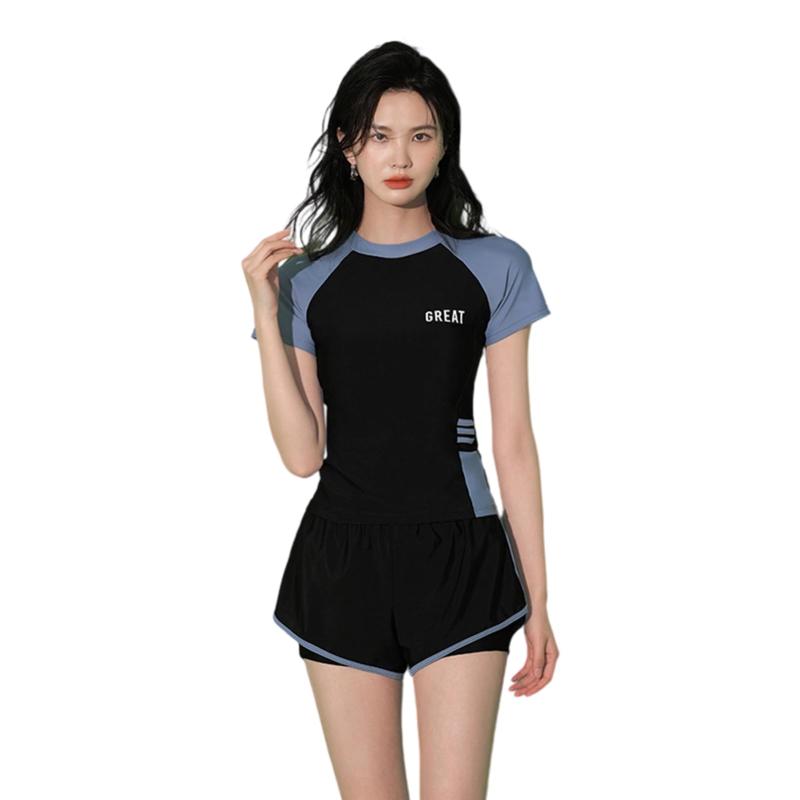 [Moerstar] 水着 レディース 体型カバー 2点セット スポーツ風 水泳 半袖 ショートパンツ 上下セット ラッシュガード 可愛い 女性用 水陸両用 フィットネス サウナ ビーチ プール 温泉 海水浴