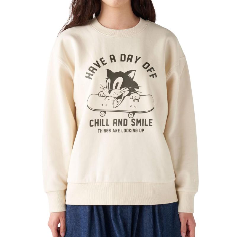 Ocean Pacific(オーシャンパシフィック) スウェットクルーネック キャラクタープリント 裏起毛 555015レディースポップなスケートボードに乗った猫のグラフィックと「HAVE A DAY OFF」「CHILL AND SMILE」といった休日らしいメッセージが魅力の、見た目も楽しい一枚です。柔らかくふんわりとした裏起毛素材が、軽量ながらもしっかりとした暖かさを提供します。