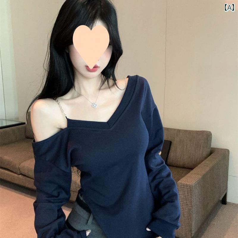 【秋デートコーデ】 レディース ワンショルダー チェーン かわいい キュート セクシー ポップ フェミニン ワン ライン カラー チェーン 長袖 スウェットシャツ レディース 春秋 オフショルダー ホット ガール トップ 10代 20代 30代
