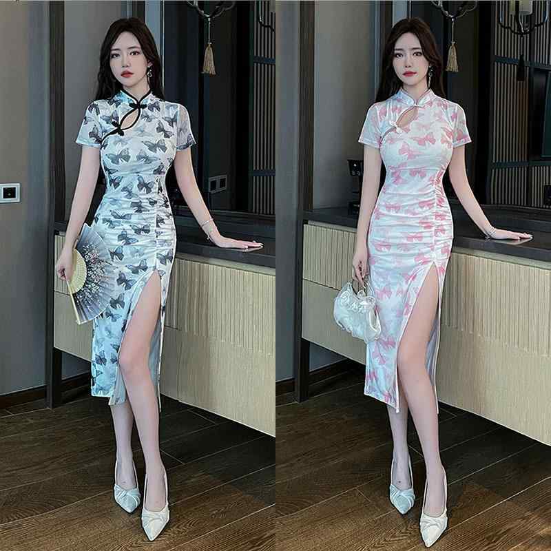 チャイナドレス レディース 中国風 レトロ エレガント セクシー ロング丈 半袖 ウエストマーク ハイウエスト 蝶々柄プリント スリット入り 切り替えデザイン タイトシルエット スタイルアップ ワンピース 春夏