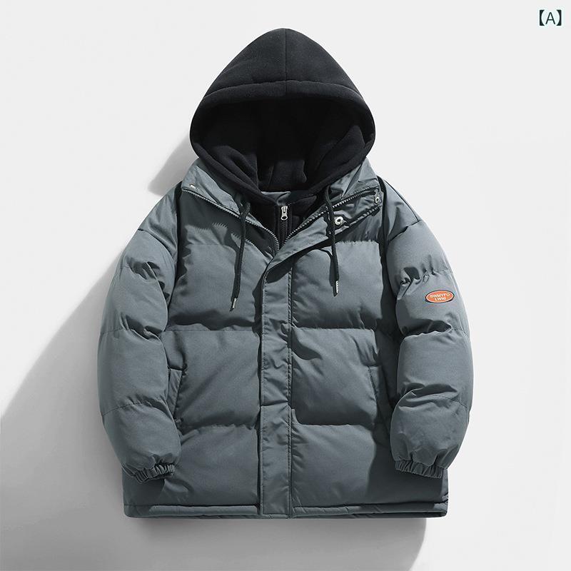 中綿ジャケット メンズ フェイクレイヤード フード付き ビッグシルエット ゆったり アウター ストリート系 カジュアル 香港スタイル 普段使い 秋冬 厚手 保温 ポリエステル グレー ブラック