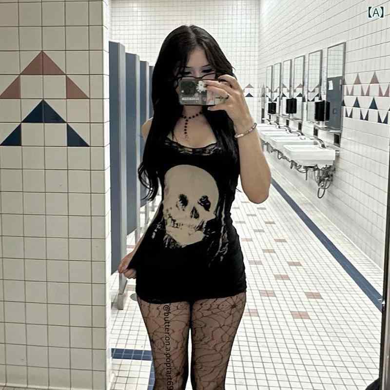 CF 23700 ダーク 系 スカルプリントキャミワンピース 2025 年 新作 ゴシック 個性 派 ストリートファッションセクシーミニスカート