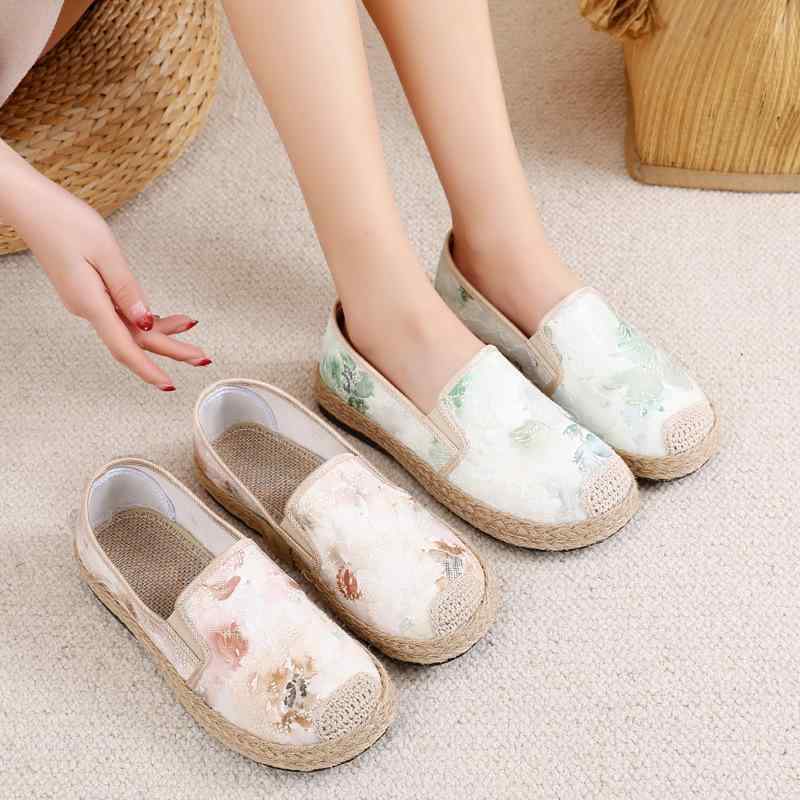 靴 レディース 婦人靴 スリッポン ぺたんこ靴 フラットシューズ 漁夫靴 通気性 中華風 チャイナ風 布靴 ローヒール 疲れない 痛くない 歩きやすい 蒸れない エスニック 和風 リラックス 快適 旅行 春夏