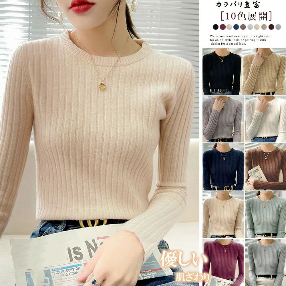リブニットトップス 長袖リブカットソー クルーネック ニットカットソー ベーシック 薄手ニット 着回し ニットプルオーバー 柔らかい