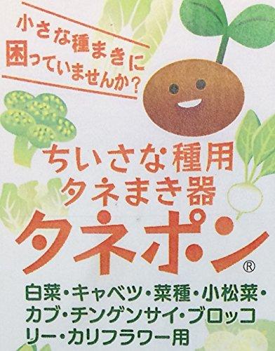 green/-/タネポン・タネポンは指でつまみにくい小さな種まきのために作られた器具です。・種の落ちる穴の大きさが約2ミリあります。2ミリより小さくて、1.6ミリぐらいまでの球形の種まき用の器具です。・キャベツ、白菜、菜類、小松菜、カブ、チンゲンサイ、ブロッコリー、カリフラワーなどの種まきに利用できます。・使用前にごみやほこりなどは、分解して、取り除いてください。種の形状や大きさなどによっては合わない場合があります。・1粒用、2粒用の部品が入っています。本体のネジをゆるめて交換してご使用下さい。タネポンは指でつまみにくい小さな種まきのために作られた器具です。種の落ちる穴の大きさが約2ミリあります。2ミリより小さくて、1.6ミリぐらいまでの球形の種まき用の器具です。キャベツ、白菜、菜類、小松菜、カブ、チンゲンサイ、ブロッコリー、カリフラワーなどの種まきに利用できます。(ごみやほこりなどは、分解して、取り除いてください。種の形状や大きさなどによっては合わない場合があります。 1粒用、2粒用の部品が入っています。本体のネジをゆるめて交換してご使用下さい。