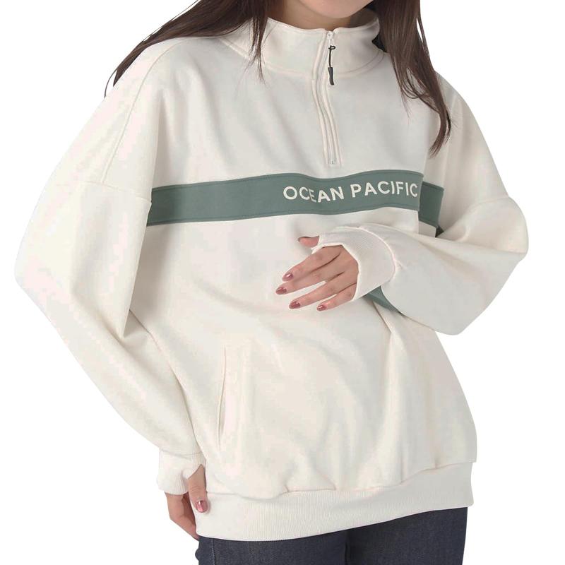 [オーシャンパシフィック] スウェット ハーフジップ スタンドカラー 裏起毛 吸汗速乾 544003 レディースバイカラー配色とルーズなサイズ感がポイントのトップス。スノーウェアのセカンドレイヤーとして最適です。吸汗・速乾性に優れた「ペアテックス」という素材を使用。春夏に大人気の素材に、裏起毛で保温性を持たせることで、防寒しながら運動時もサラッと快適に過ごすことができます。