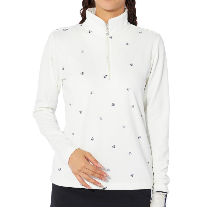 マリクレール ハーフジップ 裏シャギー プルオーバー レディース 734515W身頃に刺繍が入ったハーフジップトップス。裏は毛足のあるシャギーで肌触りがよく、暖かく体を包んでくれます。冬のゴルフシーンに最適な一枚です。