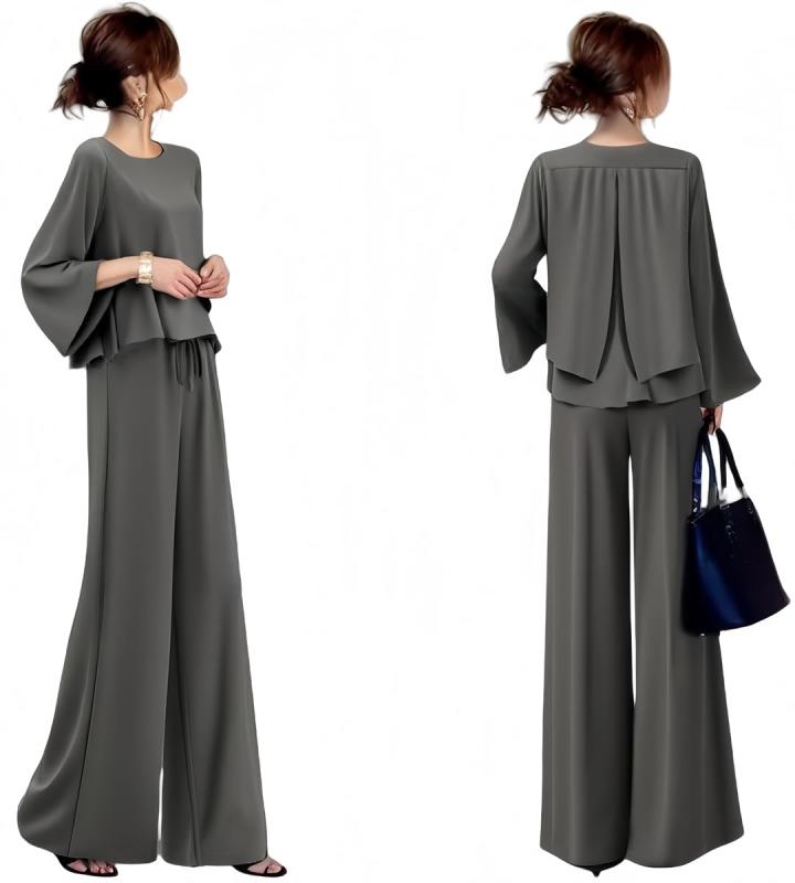[ZHENGTU] レディース パンツスーツ セットアップ トップス+パンツ ブラウス ズボン 2点セット 上下セット クルーネック ボリューム 無地 体型カバー セレモニー フォーマル 結婚式 二次会
