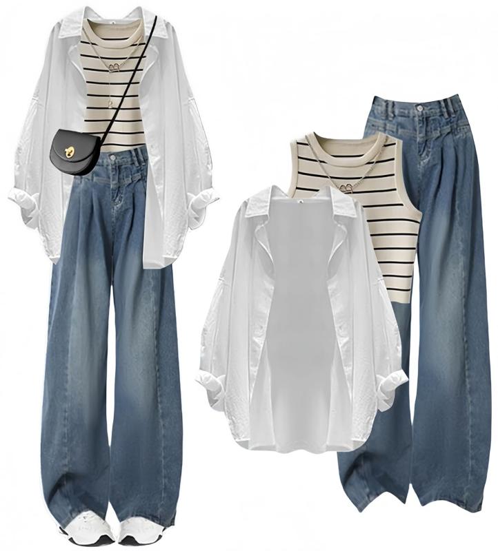 [YUANYUAN] 3点セット レディース セットアップ アウター&ボーダーベスト&ワイドパンツ パンツスーツ 夏服 シャツ デニム ロング丈 おしゃれ 体型カバー カジュアル ゆったり 可愛い 通学 大