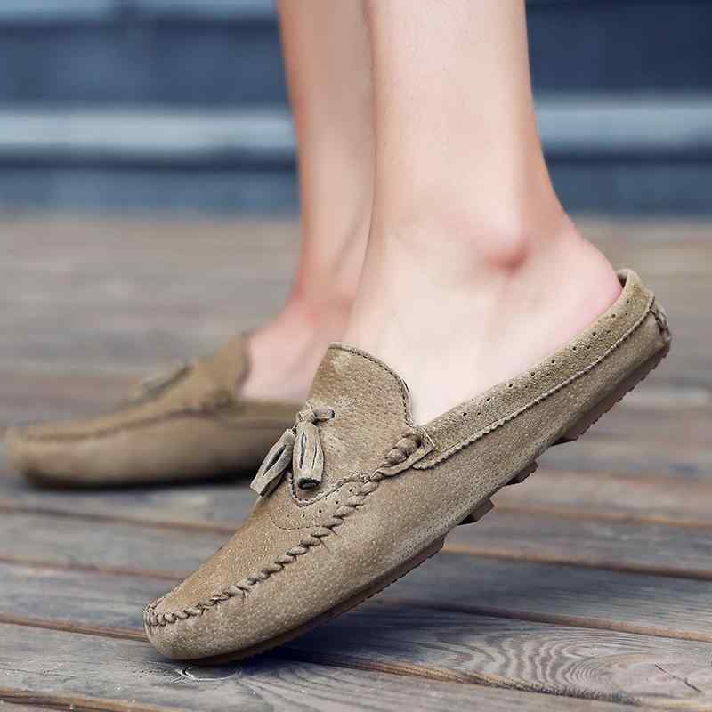 ドライビングシューズ メンズ 春夏 通気性 バックレス スリッポン かかとレス モカシン サンダル 英国風 滑り止め 耐摩耗性 ピッグレザー ラウンドトゥ フラットヒール カジュアル 普段使い 黒 グレー カーキ 紺色