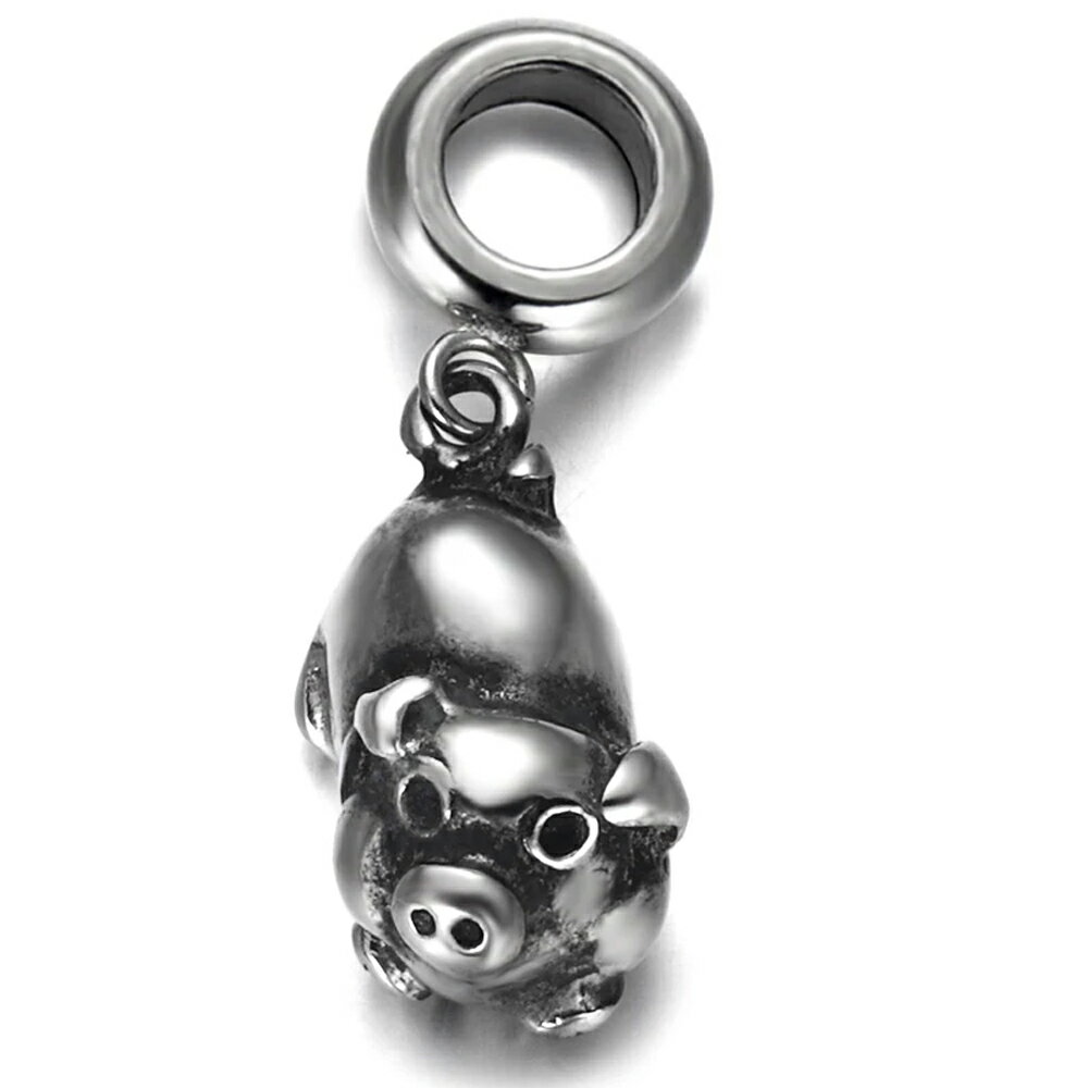 [DIY 5mm用] 豚 チャーム ステンレスビーズパーツ 1個 穴開き 通す ワイヤー 丸ひも 革紐 ロープ ステンレスパーツ ネックレス ブレスレット アンクレット 手作り 材料 修理 カスタム 金具 クラフト アクセサリー 部品 メンズ レディース シルバー 銀色 5.0mm用 男子 女子