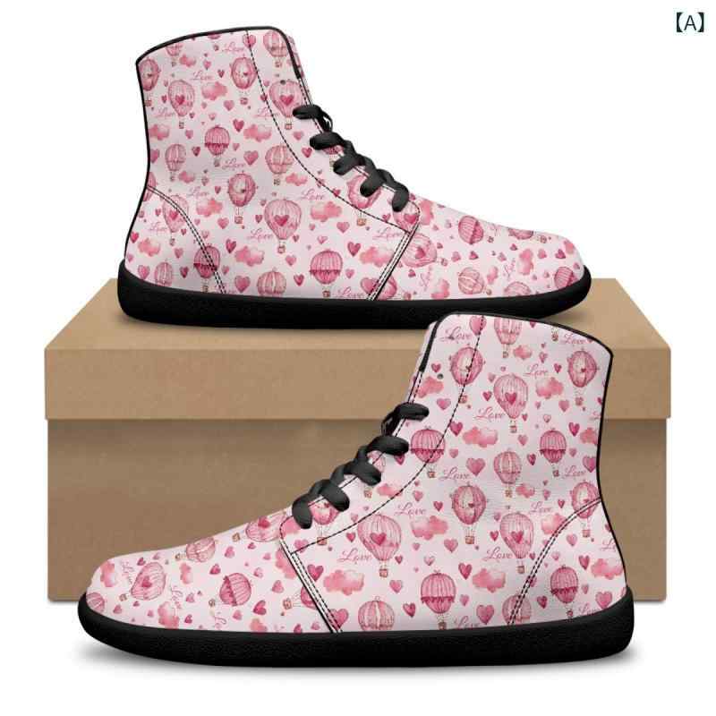 スニーカー ユニセックス 熱気球 ハート プリント柄 フロントレースアップ ハイカット シューズ カジュアル 普段使い タウンユース 軽量 快適 ローヒール EVAソール ラウンドトゥ ポリエステル裏地