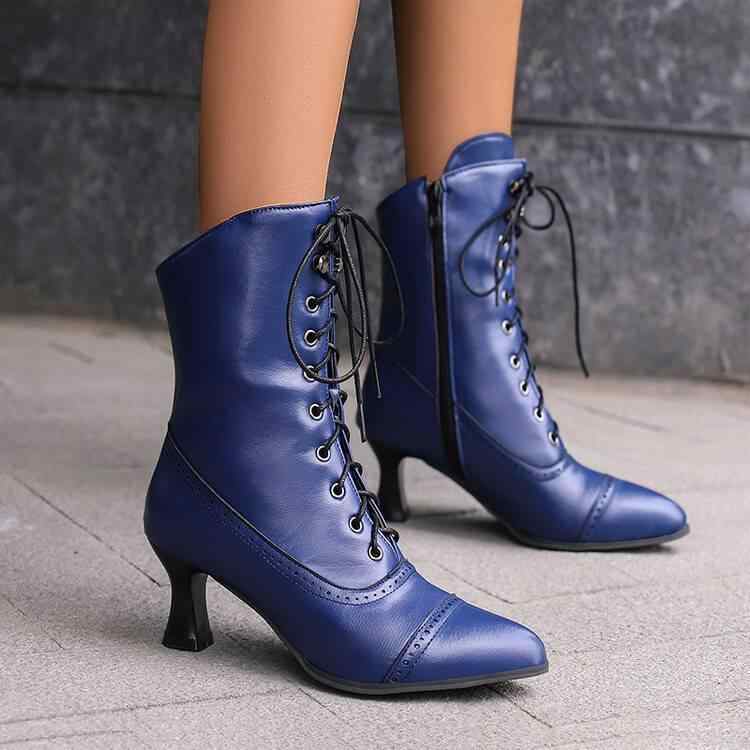 ブーツ レディース レトロ エレガント 欧米風 無地 フロントレースアップ ポインテッドトゥ ハイカット ワイングラスヒール ショートブーツ ブーティー 防寒 PUレザー フェイクレザー 冬