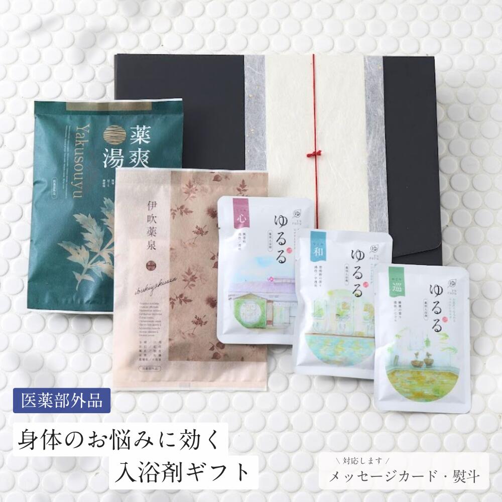 ※配達日指定のない場合は最短でのお届けとなります。 ※10セット以上ご注文の場合は、お時間をいただくことがございます。予めご了承くださいませ。 【商品名】 湯めぐり入浴剤ギフト 「温」ぬくい 【セット内容】 化粧箱入り ・飛騨浴湯:1袋(50g×1包入) ・薬爽湯:1袋(20g×2包入) ・伊吹薬泉:1袋(50g×1包入) ・ゆるる 「心」「和」「巡」:各2袋(1袋×60g) ・恵みのゆげタオル:1枚 ・ミネラルクリアソルト:1袋(200g) 【化粧箱サイズ】 ・たて225mm×よこ338mm×高さ45mm ※おおよその目安となりますので、多少の誤差はご了承ください。 ◆薬草湯 ※医薬部外品 【使用方法】 ご家庭の浴槽(150L〜200L)に本品1〜2包を破らずにそのまま入れ、よく揉み出してご入浴ください。 揉み出す際は優しく揉み出し、袋の破れにご注意ください。 ■各商品の詳細につきましては下記を参照にしてください。 【商品名】 ≫飛騨浴湯 岐阜県飛騨地方に伝わる薬湯を再現した濃厚な薬草湯です。 どこか懐かしい薬草の香りに癒され、高い温熱効果で身体を包みこみ、痛みを和らげ安眠への効果も期待できます。 ≫薬爽湯 薬草の中でも爽やかに香る10種をブレンド 生き生きとした植物の力を感じられます。 ≫伊吹薬泉 心身の滞りを薬草の効能で解きほぐす。 薬草の聖地伊吹の恵みをご家庭でお楽しみいただけます。 ◆ゆるる ※医薬部外品 【使用方法】 浴湯200Lに対し、30g〜60gを溶かして入浴してください。商品によって使用量は異なります。 ■各商品の詳細につきましては下記を参照にしてください。 【商品名】 ≫ゆるる 心 (無香料) 弱アルカリ性のとろとろな湯ざわり。心穏やかにぬくもりを味わえます。 和 (菩提樹の香り) 甘みを感じる高貴な菩提樹の香りが心身を和ませ癒しを深めてくれます。 巡 (睡蓮の香り) 清涼感溢れる睡蓮の香りと白濁したなめらかな湯が全身の巡りをととのえてくれます。 ◆恵みのゆげタオル ※泉州タオル認定商品 ■商品の詳細につきましては下記を参照にしてください。 【商品名】 ≫恵みのゆげタオル お風呂での使いやすさを追求したオリジナルタオル。温泉のおともにもピッタリな湯めぐりタオルです。 ◆デッドシーミネラルクリアソルト 【商品名】 ≫ミネラルクリアソルト ミネラルとマグネシウムを豊富に含む死海の塩は、 よく身体を温め、老廃物の排出を促進するので疲労回復 につながります。 【保存方法】 高温・多湿・直射日光を避けて、 乳幼児の手のとどかないところに保管してください。 【ご注意】 【必ずお読みください】 ●入浴以外の用途には使わないでください。 ●本品は食べられません。 ●皮膚あるいは体調に異常がある場合は医師にご相談の上ご使用ください。 ●使用中や使用後、皮膚に発疹、発赤、かゆみ、刺激感等 の異常が現れた場合、使用を中止し医師にご相談ください。 ●本品には浴槽・風呂釜を傷めるイオウは入っておりませんが、全自動給湯器・24時間風呂の場合、機種によってはご使用になれない場合があります。お使いの機種の説明書を確認の上ご使用ください。 ◎薬草湯 ●袋が破れることがありますので、強く揉みすぎないようご注意ください。 ●袋の編目から薬草の粉末が出てくることがあります。 ●残り湯を洗濯に使用しないでください。 ●本品は自然の生薬を使用しているため、浴槽の材質によっては色が付着する場合があります。使用後はすぐに浴槽洗浄をしてください。 ◎ゆるる ●入浴時、浴そうや洗い場がすべりやすくなりますのでご注意ください。 ●本品は風呂釜や浴そうをいためるイオウは含みません。 (心) ただし、天然原料使用のため浴そうに残り湯を長くためておくと、 ごくまれに水質等の関係からざらついたり、温泉成分が付着し落ちにくくなる場合がありますのでお早めのお掃除をおすすめします。 ●湯質はおだやかな弱アルカリ性。赤ちゃんからご高齢の方までお使いいただけます。 ●洗髪や洗顔にもお使いいただけます。 ●天然大理石の浴そうは光沢を失する恐れがありますのでお避けください。 ●本品は長期間を経ても効果は変わりません。 ●入浴以外の用途には使わないでください。 ●本品と他の入浴剤の併用はお避けください。 ●本品は食べられません。万一大量に飲み込んだときは、水を飲ませるなどの処置をおこない、医師にご相談ください。 ●ヒトパッチテスト済みですが、全ての方にアレルギーが起こらないということではありません。 ●皮ふ、又は体質に異常のある場合は医師に相談してご使用ください。 ●使用中や使用後、皮ふに発疹、発赤、かゆみ、刺激感などの異常が現れた場合は使用を中止し医師にご相談ください。 ●本品は温泉と全く同一というわけではございません。 【残り湯について】 ●残り湯は洗濯に使えますが柔軟仕上げ剤との併用やおろしたての衣類の洗濯にはお使いにならないでください。又つけおきはせず、すすぎは清水をお使いください。 【(和)(巡)にごり成分について】(和)(巡) ●