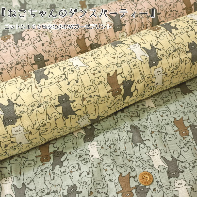 『ねこちゃんのダンスパーティー』コットン100%ふわふわやわらかWガーゼプリント素材:コットン100% 生地幅:約108cmネコ/ベビー/キッズ/女の子/男の子/綿/ダブルガーゼ/ハンドメイド/手作り/ウェアー/ベビーグッズ/小物/スタイ/