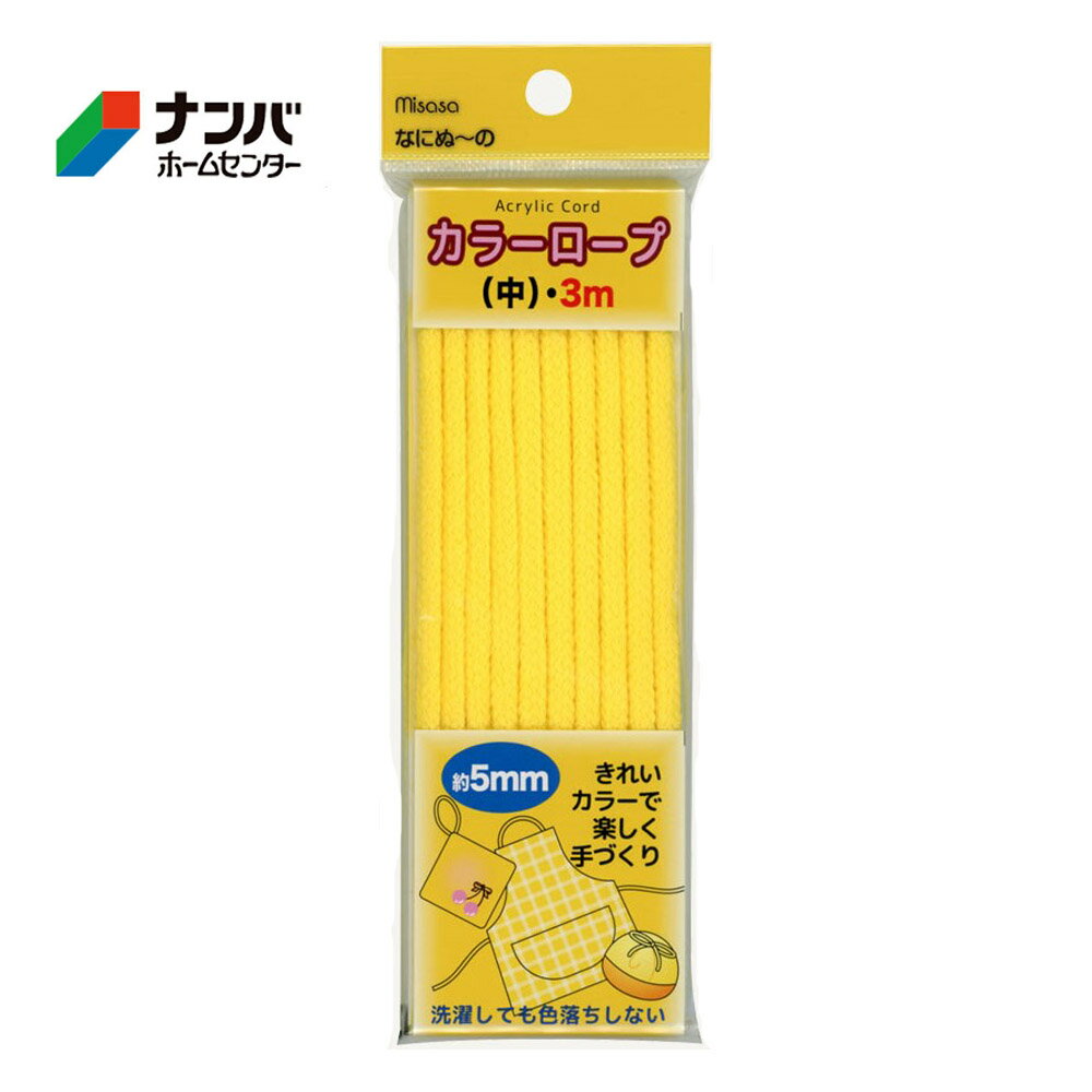 【仕様】 ●サイズ:直径 約5mm、長さ 3m ●品質:アクリル100% ●手芸・小物づくりなどアイデアでいろいろな物にお使い下さい ●原産地:日本 【商品特長】 ●軽くて強く、速乾性に優れています。 ●色落ちしにくく、きれいな色が長持ちします。 ●ミシン縫いができますので、パイピングなどカーブもきれいにできます。 【使用上の注意】 ●接着の場合はアクリル系樹脂用の接着剤をご使用下さい。