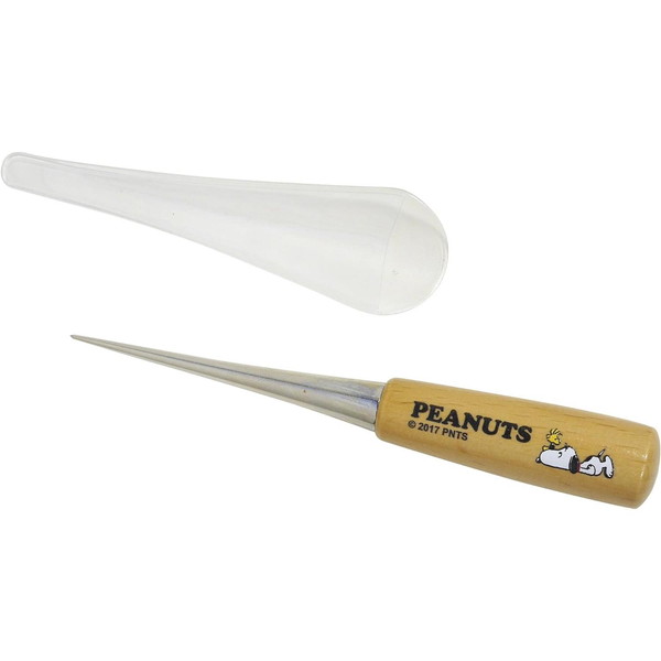 ミササ 『スヌーピー目打ち8591』穴あけや、縫い返しの角出しに便利です穴開けや、縫い返しの角出しに便利です。■サイズ:W15XH106XD15mm■材質:鉄・ニッケルメッキ(軸)木(ハンドル) PVC樹脂(キャップ) ■生産国:日本・中国