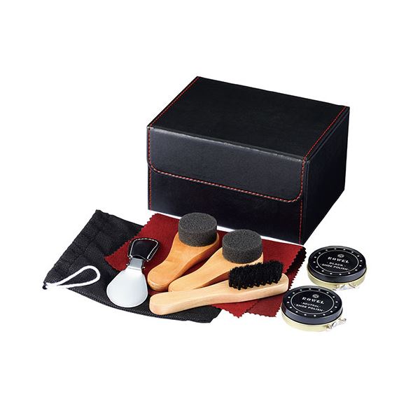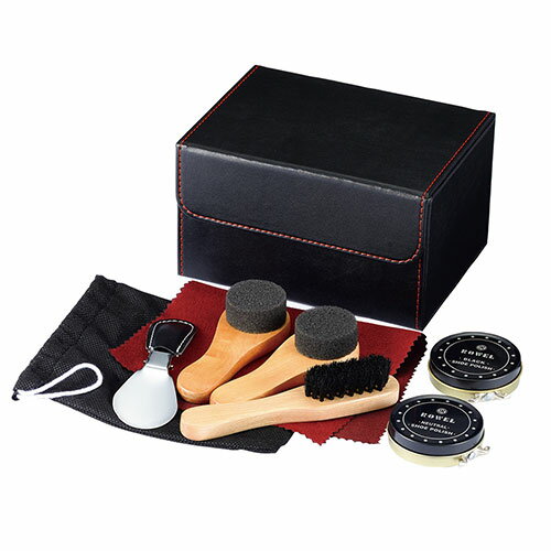 様々なシューケアアイテムがコンパクトなボックスの中に。靴磨きセット収納ポーチも付いているので、出張先や旅行先でも大活躍。赤いステッチがオシャレなレザー調のケースは、マグネット式で小物入れにも使えます。◎セット内容・材質/ケース(12×16×9.5cm、ポリウレタン)、靴クリーム(φ6.5×1.5cm、17.5ml、油性クリーム)×2(黒・無色)、ブラシ(13.3cm、木・ポリプロピレン)、スポンジ(10.6cm、木・ウレタン)×2、靴べら(4×12×1cm、スチールクロームメッキ・合皮)、布(15×24cm、ポリエステル)、袋(15×14.5cm、 不織布) ◎箱サイズ/12.5×16.5×10cm ◎重量/400g