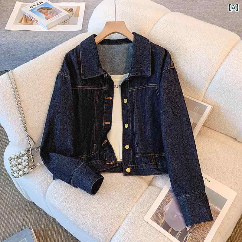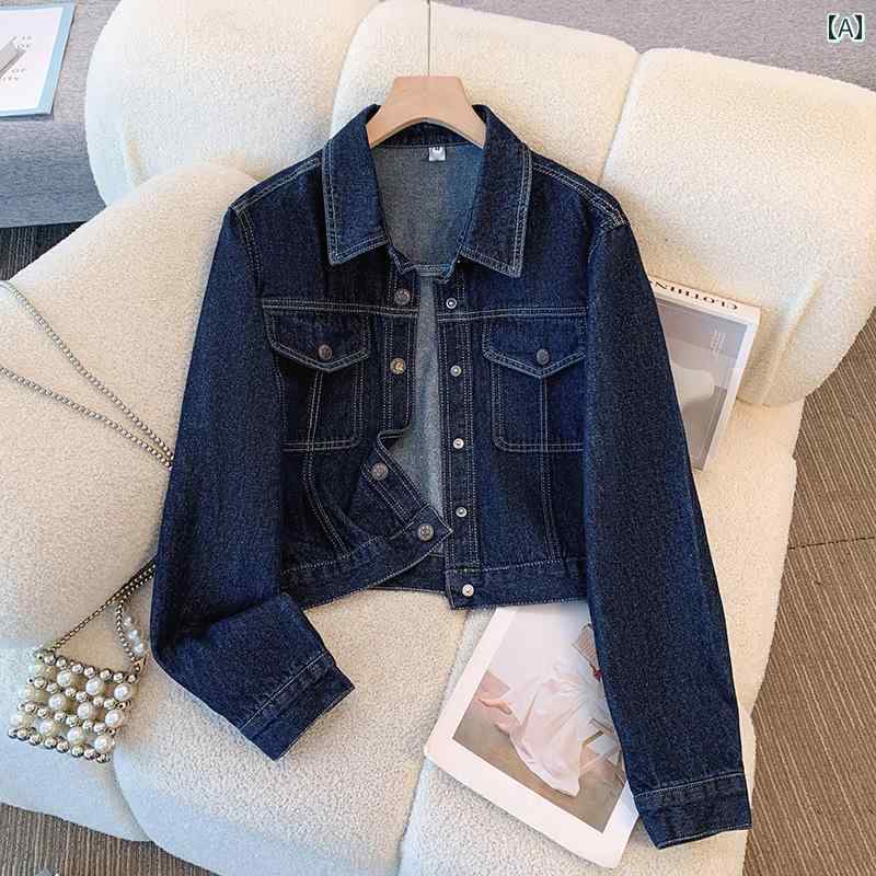 ダークブルー スタイル レトロ ス 長袖 ショート シンプル レディース デニムジャケット 女性用 春秋 カジュアル