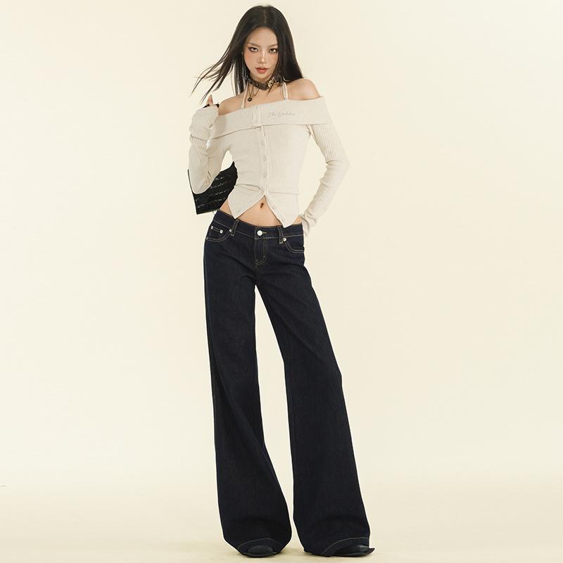 デニム レディース ローライズ ブーツカット ジーンズ ジーパン ズボン・パンツ ワイドパンツ ゆったり 体型カバー 美脚 脚長効果 着痩せ 中厚手 コットン ブルー