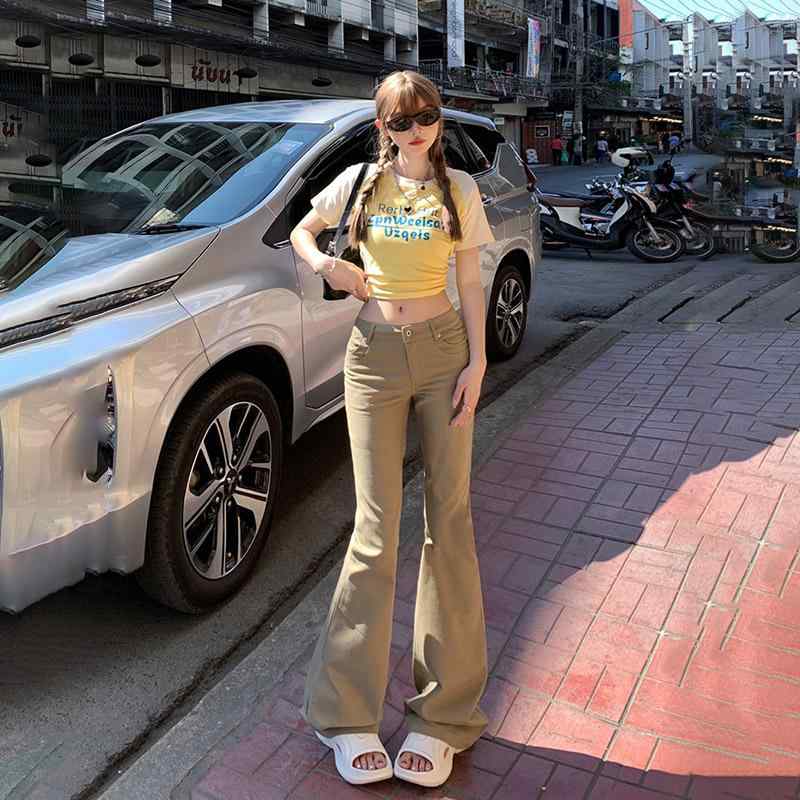 デニム レディース ローライズ ブーツカット ジーンズ カーキ 高ストレッチ 美脚 脚長 ロングパンツ カジュアル スタイル ジーパン ズボン