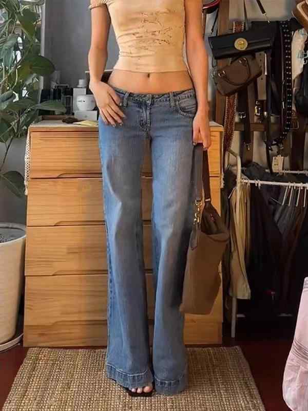 デニム レディース ローライズ ブーツカット ジーンズ ジーパン ズボン パンツ カジュアル ゆったり ストレート ウォッシュ加工 ブルー