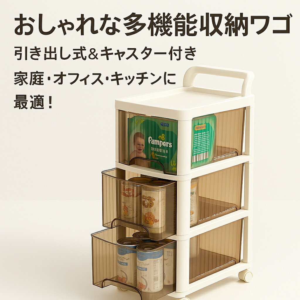 商品紹介 :収納ワゴン キャスター付き 材質:PP 毎日の暮らしにちょうどいい 『キャスター付き 多機能収納ワゴン』 ✔️【省スペースで大容量】 スリムなデザインで、冷蔵庫や洗濯機の横、ちょっとしたすき間にぴったり。4段の引き出しで、調味料や日用品、化粧品、赤ちゃん用品などをすっきり収納。 ✔️【引き出しロック機能付き】 内蔵式の滑り止めストッパーで、引き出しが抜け落ちにくく安全。 ✔️【360°回転キャスター&ストッパー】 移動もスムーズ、必要な場所で簡単に固定できるロック付きキャスターを採用。 ✔️【透明&おしゃれなデザイン】 中身が一目で分かるクリアタイプの引き出し。上品なホワイトベージュとスモークカラーで、どんなインテリアにもなじみます。 ✔️【組立不要・届いてすぐ使える】 完成品でお届け。面倒な組み立ては不要で、開封後すぐにご使用いただけます。 ✔️【様々なシーンで大活躍】 キッチン、リビング、寝室、洗面所、ベランダなど、家庭のあらゆる場所にフィット。 ※海外製品の為、実寸が多少異なる商品も御座います。 1、PC環境・光の具合により、色や素材のイメージが写真と若干異なる場合がございます。 2、商品写真はできる限り実物の色に近づけるよう加工しておりますが、 お客様のお使いのモニター設定、お部屋の照明等により実際の商品と色味が異なる場合がございます。 予めご了承くださいますようお願い致します。 3、商品の仕様は改良等のため予告なく変更する場合があります。また本サイトの写真とお届け商品の色合いが多少異なる場合や、制作の都合上、柄などの出方が写真と異なる場合がございますので、ご了承下さい。