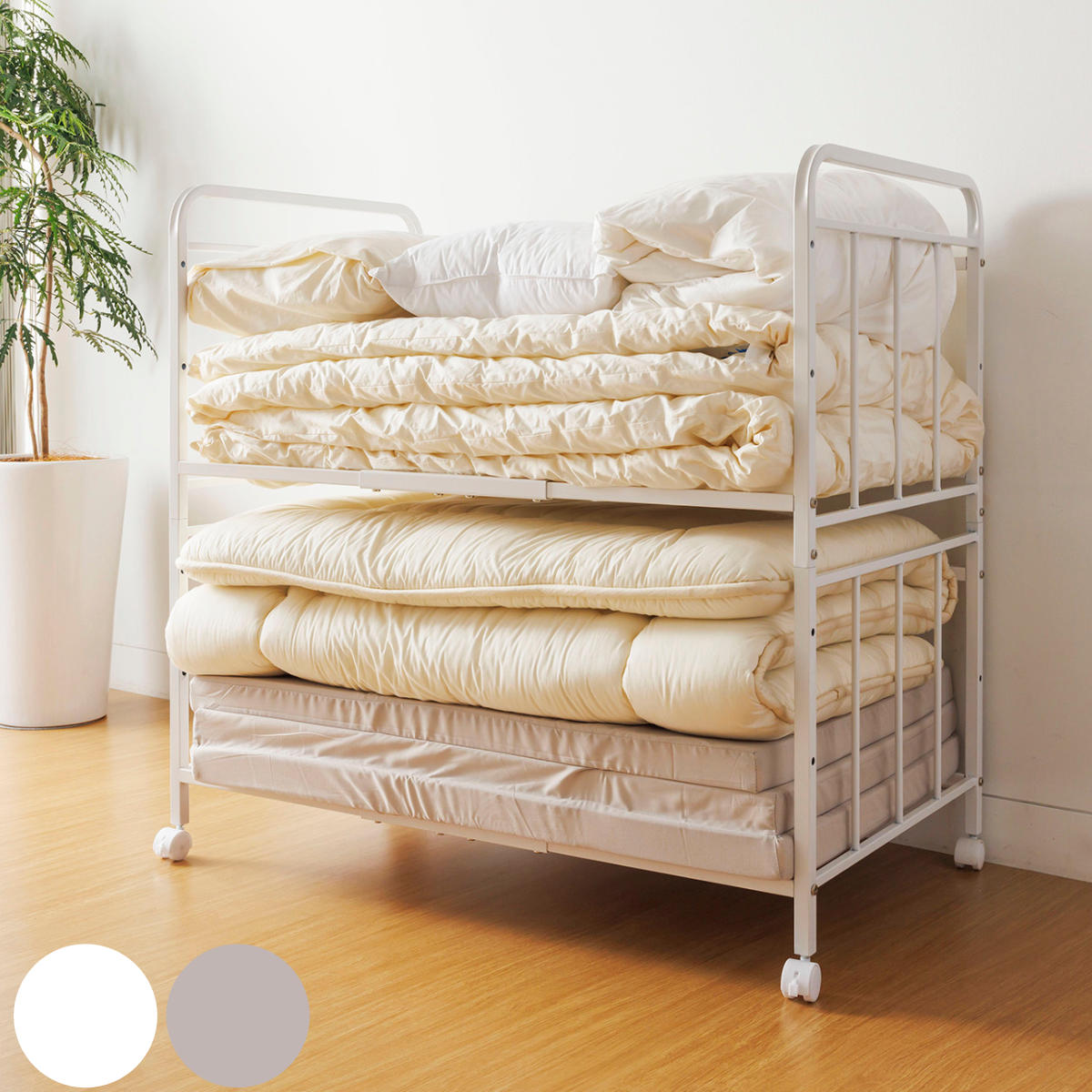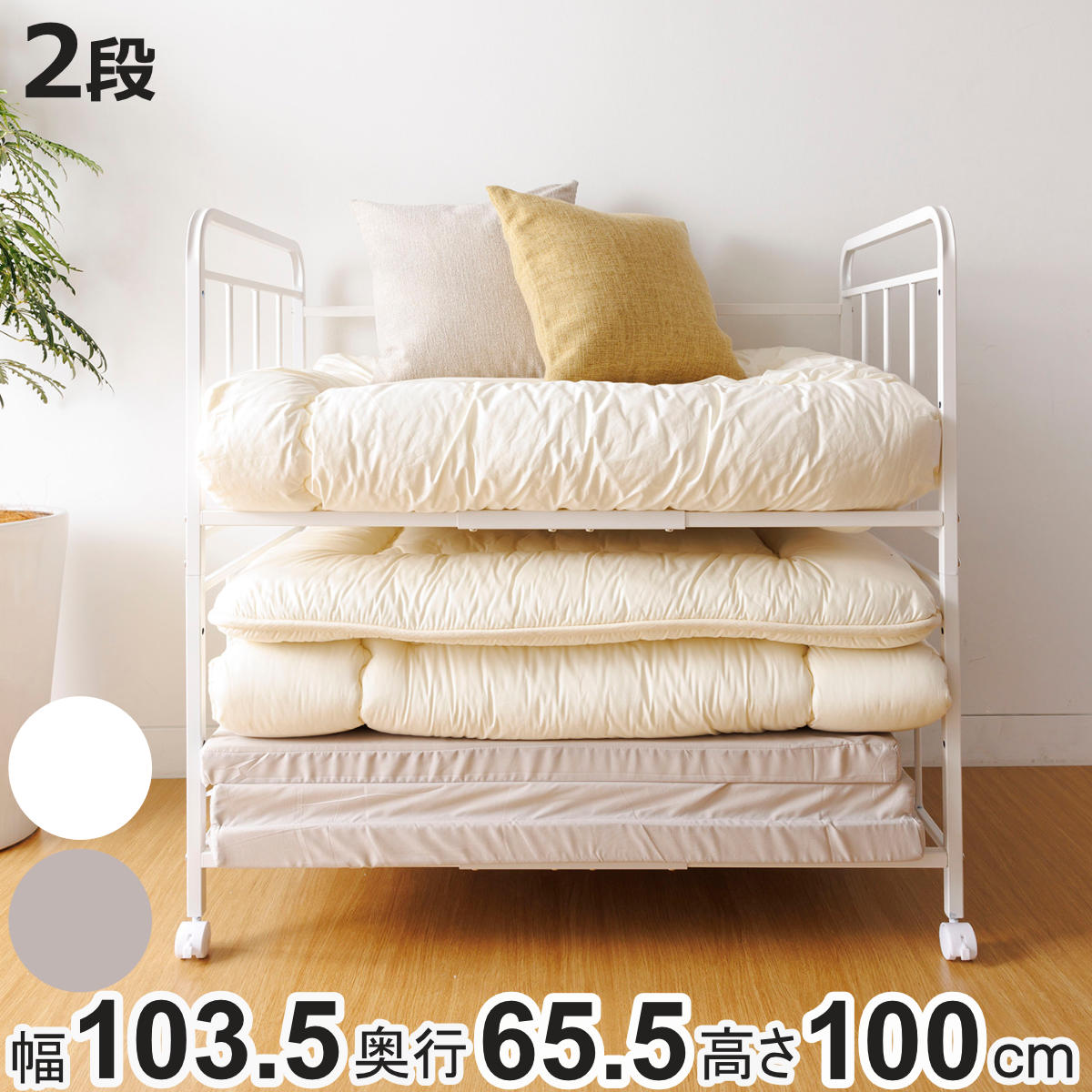 布団収納ラック2段 幅103.5奥行65.5高さ100cm キャスター付き ( 布団 収納 ラック ワゴン ふとん シングル 掛け布団 敷き布団 マットレス 通気性 高さ調節 収納棚 布団ラック ふとん収納 棚 クローゼット 押し入れ 移動 楽 丈夫 白 )【3980円以上送料無料】