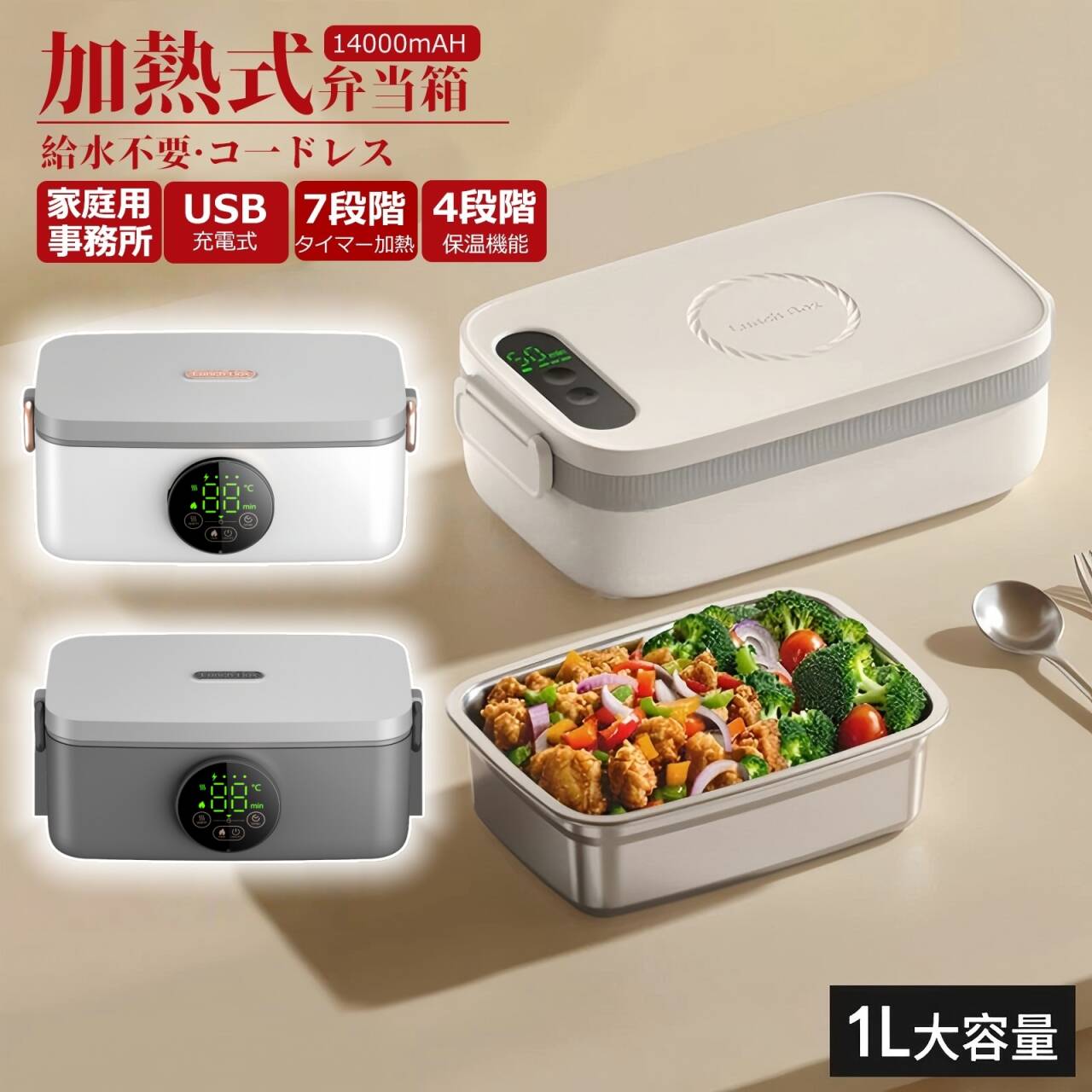 【充電式加熱弁当箱】電熱弁当箱 保温弁当箱 コードレス メンズ 保温ランチジャー 弁当ボックス 1L大容量 ポータブル 学校 オフィス用 お弁当加熱 ランチボックス 水必要なし 14000mAh大容量バッテリー 携帯便利 アウトドア トラック ドライブ 車中泊 釣り 登山 キャンプ