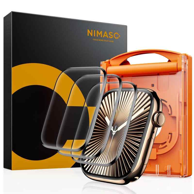 【3枚組】 NIMASO フィルム ガイド枠付き Apple Watch series 11(2025)/ 10(2024)46mm 対応 アップルウォッチ 11 / 10 用 保護フィルム 自動除塵 黒縁全面保護 高透過率 気泡防止 指紋防止 傷防止 貼り【対応機種】:Apple Watch series 11(2025)/ 10(2024)46mm 用【貼付け超簡単】人気のNIMASOがついに、初めての方でも簡単に貼り付けることができるガイド枠を発売いたしましたこれで貼付けはさらに簡単にwatchをガイド枠に置いて、フィルムを説明書通りに貼るだけで気泡やズレの心配はありません。貼付けの動画もご用意しておりますので、貼付け前にご確認いただくことをおすすめいたします。【黒縁全面保護・全新複合材料】新世代のPET複合材料、アップグレードされたカーボンファイバーソフトエッジを採用しており高い柔軟性があります。破損しやすいエッジのトラブルとはおさらば。曲線に沿って黒縁取りされていることでアップルウォッチの画面全体をカバーでき、落下や衝撃による損傷からwatchを守ります。曲線部分も含め全画面を覆うことで、どんな角度から落ちてもフチ割れの心配はありません。 ご注意:全面保護のため、一部のケースと干渉がある場合がありますので、サイズに合わせて慎重にお買い求めください。【高透過率&高感度タッチ】高透過率を持つ極薄PET素材のため透明度が高く、Watch画面の精細さを損ないません。また、高品質な素材を採用しているのでフィルムを装着している違和感はなく、タッチ感度も抜群です。3Dラウンドエッジ加工が施されており、サイドからの衝撃に耐える頑丈さを持ちながら、触ったときの引っ掛かり感はなく、快適で滑らかな質感を実現しました。【汚れ防止・指紋防止】撥水撥油コーティングを施しているため、指紋などの汚れが付きにくく、万が一、汚れが付いても拭き取ることで簡単に綺麗になるので、長時間、画面がキレイな状態を維持できます。ただし、長時間水に触れると剥がれる恐れがありますのでご注意ください。
