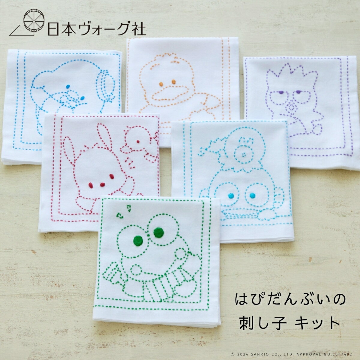 ちくちく刺すだけで簡単! はぴだんぶいの刺し子ふきんキット サンリオの個性あふれる6人の男の子キャラクターたち「はぴだんぶい」の魅力が詰まった刺し子キットです。 糸の色は、キャラクターイメージの色(メンバーカラー)を選んでいます。 作品は約34×34cm。食器を拭いたり、ちょっとした目隠しとしてかごにかけたり、使いやすい大きさです。 はじめてさんでも簡単&かわいい! キットの魅力 広げたときも、畳んだときも、いつでもキャラクターがかわいく見えるようなデザインにこだわりました。糸は優しい手触りの綿100%で、ふきんに適した糸をセレクト。 刺し子布には、水で消えるインクで図案が印刷されています。機械で大量にプリントをせずに、一枚一枚、手作業で丁寧にプリントされています。 図案を写す手間がなく、キャラクターたちの本来の表情を正確に刺せるのが、最大の魅力! 刺し終わった後、水洗いすれば、余計な線が残らないので、初心者さんでも簡単にかわいく仕上げることができます。 初めての方にも安心なワンポイント動画もキットのレシピ内の二次元コードよりご覧いただけます。 オリジナルデザインのタグ タグには「はぴだんぶい」の6キャラクターたちのサイズ感がよくわかる、かわいいイラストをあしらっています。二つ折りにして縫い込むと、飾りとしてだけでなく、フック等にかける際のループとしてもお使いいただけます。 ポチャッコ 好奇心旺盛でおっちょこちょいで、ちょっぴりおせっかいな、イヌの男の子「ポチャッコ」のかわいいポーズが刺し子になったふきんが作れます。 広げたときも、たたんだときも、いつでもキャラクターがかわいく見えるようなデザインにこだわりました。 あひるのペックル 泳ぎが苦手で、歌とダンスが大好き! ココロのやさしいあひるの男のコ「ペックル」のかわいいポーズが刺し子になったふきんが作れます。 バッドばつ丸 いたずら好きで、あまのじゃくなペンギンの男のコ「バッドばつ丸」のかわいいポーズが刺し子になったふきんが作れます。 けろけろけろっぴ 冒険好きで、元気いっぱい! 歌が上手なカエルの男のコ「けろっぴ」のかわいいポーズが刺し子になったふきんが作れます。 ハンギョドン 人を笑わせることが得意だけど、さびしがり屋のロマンチスト「ハンギョドン」のかわいいポーズが刺し子になったふきんが作れます。 タキシードサム 食いしん坊で、ちょっぴりドジくんな、おしゃれなペンギンの男のコ「サム」のかわいいポーズが刺し子になったふきんが作れます。 材料セット 完成サイズ約34×34cm(※洗濯前のサイズ。水につけると1割程度縮みます) セット内容刺し子布(綿100%・晒)、刺し子糸(綿100%・ブルー)、刺し子針 1本(鋼製)、タグ(ポリエステル100%)、刺し子キットの基本レシピ ご用意いただくものはさみ、手縫い糸、アイロン (商品カテゴリ)手芸 キット 手芸キット 手作り 手づくり ハンドメイド 手芸用品 材料 インテリア かわいい 素敵 おしゃれ 趣味 プレゼント ギフト クラフト ものづくり モノづくり 手仕事 趣味 ホビー 母の日 大人向け handmade クラフトキット 犬 いぬ イヌ