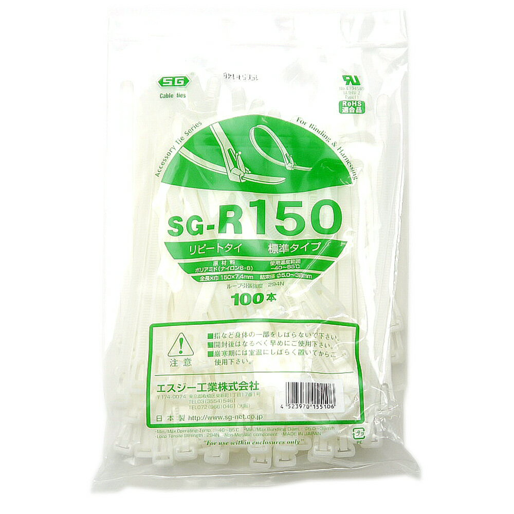 エスジー工業製プロ仕様結束バンド「エスジータイ」のリピートタイプ。結束した後でも何度も取り外し可能で、メンテナンスを必要とする場所(屋外工事シートなど)で繰り返し使用する場合に適しています。■厳しい基準をクリア: UL規格をはじめとする様々な規格をクリアしていますので、難燃性、自己消火性、電気絶縁性、耐候性、耐熱性に優れ幅広い分野で目的に応じてご使用いただけます。 ■特徴: 独自の設計機構により、軽快な嵌合作業性と強い結束力を持たせ、長期の係合に耐えうるケーブルタイです。 ハイグレードのナイロン6.6を素材とした一体成形製品ですので、安心してご使用いただけます。 ■その他ラインアップ:リピートタイ 耐候耐熱タイプ、SGタイ 標準タイプ、SGタイ 耐候耐熱タイプ等も出品中です。 【カラー】:白(透明) 【本数】:100本入 【サイズ】:全長150mm、幅7.4mm 【結束径】:φ5.0~38mm 【ループ引張強度】:294N 【使用温度範囲】:-40~85℃ 【原材料】:ポリアミド(ナイロン6.6)結束バンド 取り外し可能な再利用型 屋内用 SGリピートタイ (長さ150mmSG-R150) 説明 エスジー工業製プロ仕様結束バンド「エスジータイ」のリピートタイプ。結束した後でも何度も取り外し可能で、メンテナンスを必要とする場所(屋外工事シートなど)で繰り返し使用する場合に適しています。■厳しい基準をクリア: UL規格をはじめとする様々な規格をクリアしていますので、難燃性、自己消火性、電気絶縁性、耐候性、耐熱性に優れ幅広い分野で目的に応じてご使用いただけます。 ■特徴: 独自の設計機構により、軽快な嵌合作業性と強い結束力を持たせ、長期の係合に耐えうるケーブルタイです。 ハイグレードのナイロン6.6を素材とした一体成形製品ですので、安心してご使用いただけます。 ■その他ラインアップ:リピートタイ 耐候耐熱タイプ、SGタイ 標準タイプ、SGタイ 耐候耐熱タイプ等も出品中です。 Item Information 説明 エスジー工業製プロ仕様結束バンド「エスジータイ」のリピートタイプ。結束した後でも何度も取り外し可能で、メンテナンスを必要とする場所(屋外工事シートなど)で繰り返し使用する場合に適しています。■厳しい基準をクリア: UL規格をはじめとする様々な規格をクリアしていますので、難燃性、自己消火性、電気絶縁性、耐候性、耐熱性に優れ幅広い分野で目的に応じてご使用いただけます。 ■特徴: 独自の設計機構により、軽快な嵌合作業性と強い結束力を持たせ、長期の係合に耐えうるケーブルタイです。 ハイグレードのナイロン6.6を素材とした一体成形製品ですので、安心してご使用いただけます。 ■その他ラインアップ:リピートタイ 耐候耐熱タイプ、SGタイ 標準タイプ、SGタイ 耐候耐熱タイプ等も出品中です。 カラー、本数 【カラー】:白(透明) 【本数】:100本入 サイズ、結束径 【サイズ】:全長150mm、幅7.4mm 【結束径】:φ5.0~38mm 原材料 【原材料】:ポリアミド(ナイロン6.6) 備考 【ループ引張強度】:294N 【使用温度範囲】:-40~85℃