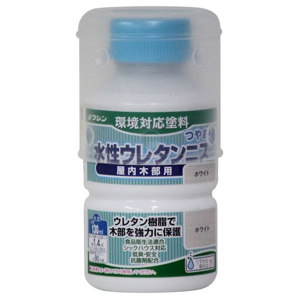 【商品説明】●屋内の木部や実用家具、工作品に適しています。●臭いが少なく、扱いやすい水性塗料です。●乾くと硬い塗膜ができるので、実用的なものにも使えます。●カラーバリエーションとして、色付きのつや消しシリーズが追加されました。●用途:木工作品、組立家具、屋内の木部(床、手すり、窓わくなど)。●食品衛生法に適合しているので、菓子皿や箸などの食器にも使用できます。●また、お子様のおもちゃや食卓にもお勧めです。(完全に乾いていることが条件になります。完成後、7〜10日ほど乾燥期間を取ってください)●食品衛生法 厚生省告示第370号 合成樹脂一般規格適合。●【食品衛生法について】:当社製品にある「食品衛生法適合」の表記は、水温60℃・試験時間30分の条件で、溶出する指定有害物質が規定量以下であることを意味しています。作品を常温で使用することを想定しておりますので、塗装容器を煮沸するなど、想定を超える使い方をすると適合数値を外れる場合があります。●商品サイズ(約):縦幅54×横幅54×高さ106mm●商品重量(約):0.17kg●容量:130ml●カラー:ホワイト●塗り面積(2回塗りした場合の目安/約):1.4m2/畳0.9枚●乾燥時間:約90分/20℃●ホルムアルデヒド放散等級:F☆☆☆☆●水性ウレタン系エマルション塗料●うすめ液:水(原液のままでも使用できます)