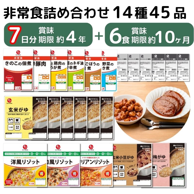 賞味期限を理由とした返品交換はお承りかねます。ココロとカラダを気づかう防災食セット7日分。毎食おかずか汁物が食べられる充実の12種42食入り。スプーン付き。「おいしさ」「食べやすさ」「保存しやすさ」に注目しました。バラエティ豊かな5種類のアルファ化米は、水またはお湯を注ぐだけの簡単調理。レトルトおかゆや肉じゃが・豚汁などのおかず・汁物は常温でもおいしく食べられます。普段の食事に取り入れやすいメニューをラインナップ。防災食を日ごろから食べて備蓄する「ローリングストック」にもおすすめです。●セット内容<アルファ化米>白米×3、五目御飯×3、きのこ御飯×3、わかめ御飯×3、ドライカレー×3<災対食パウチ>おかゆ×3、野菜入りおかゆ×3、けんちん汁×4、豚汁×5、筑前煮 ×4、肉じゃが ×4、きのこ汁×4【白米】●内容量約100g(出来上り容量約260g)●原材料うるち米100%(国産)●栄養成分表示(1袋100gあたり)※サンプル品分析による推定値熱量:381kcalたんぱく質:6.7g脂質:1.0g炭水化物:86.2g食塩相当:0.01g【五目御飯】●内容量約100g(出来上り容量約260g)●原材料うるち米(国産)、こんにゃく、乾燥しいたけ、食塩、乾燥にんじん、乾燥ごぼう、砂糖、かつお節エキス、パーム油、生姜、乾燥ひじき、ほたてエキス調味料/調味料(アミノ酸等)、カラメル色素、水酸化カルシウム、酸化防止剤(V.E)●栄養成分表示(1袋100gあたり)※サンプル品分析による推定値熱量:379kcalたんぱく質:7.6g脂質:2.1g炭水化物:82.4g食塩相当:2.39g【きのこ御飯】●内容量約100g(出来上り容量約260g)●原材料うるち米(国産)、水煮ぶなしめじ(国内製造)、水煮エリンギ、こんにゃく、みりん、食塩、調味液、乾燥しいたけ、乾燥にんじん、砂糖、パーム油、昆布エキス/調味料(アミノ酸等)、カラメル色素、水酸化カルシウム、酸味料、酸化防止剤(V.E)、香料●栄養成分表示(1袋100gあたり)※サンプル品分析による推定値熱量:376kcalたんぱく質:7.6g脂質:1.8g炭水化物:82.4g食塩相当:2.54g【わかめ御飯】●内容量約100g(出来上り容量約260g)●原材料うるち米(国産)、砂糖、わかめ、食塩、昆布パウダー/調味料(アミノ酸等)●栄養成分表示(1袋100gあたり)※サンプル品分析による推定値熱量:379kcalたんぱく質:7.3g脂質:1.0g炭水化物:85.2g食塩相当:1.22g【ドライカレー】●内容量約100g(出来上り容量約260g)●原材料うるち米(国産)、乾燥具材(とうもろこし、人参、ぶどう糖)、調味粉末(カレースパイス、オニオンエキスパウダー、食塩、食物繊維(イヌリン)酵母エキス、デキストリン、植物油脂)/トレハロース、調味料(アミノ酸等)、微粒酸化ケイ素●栄養成分表示(1袋100gあたり)※サンプル品分析による推定値熱量:381kcalたんぱく質:7.2g脂質:1.6g炭水化物:84.5g食塩相当:1.23g【おかゆ】●内容量約250g●原材料名米(新潟県産)/酸化防止剤(ビタミンC)●栄養成分表示(1食250gあたり)エネルギー:87kcalたんぱく質:1.5g脂質:0.2g炭水化物:18.8g食塩相当量:0.0gこの表示値は目安です。【野菜入りおかゆ】●内容量約250g●原材料名米(新潟県産)/酸化防止剤(ビタミンC)●栄養成分表示(1食250gあたり)エネルギー:87kcalたんぱく質:1.5g脂質:0.2g炭水化物:18.8g食塩相当量:0.0gこの表示値は目安です。【けんちん汁】●内容量約250g●原材料名野菜(大根、人参、じゃが芋、椎茸、ごぼう)、醤油(小麦・大豆を含む)、車麩、油あげ、植物油脂、砂糖・ぶどう糖果糖液糖、かつお節エキス、肉エキス(鶏肉・豚肉を含む)、食塩/調味料(アミノ酸等)、酸化防止剤(ビタミンC)●栄養成分表示(250gあたり)エネルギー:108kcalたんぱく質:3.2g脂質:5.1g炭水化物:13.1g食塩相当量:2.7gこの表示値は目安です。【豚汁】●内容量約250g●原材料名野菜(人参、大根、玉ねぎ、じゃが芋、ごぼう)、味噌(大豆を含む)、豚肉、こんにゃく、みりん、かつお節エキス(小麦を含む)、肉エキス、砂糖・ぶどう糖果糖液糖/調味料(アミノ酸等)、酸化防止剤(ビタミンC)●栄養成分表示(250gあたり)エネルギー:155kcalたんぱく質:6.0g脂質:8.1g炭水化物:13.6g食塩相当量:2.4gこの表示値は目安です。【筑前煮】●内容量約200g●原材料名野菜(人参、たけのこ、れんこん、ごぼう)、こんにゃく、鶏肉、醤油(小麦・大豆を含む)、砂糖、みりん、肉エキス/調味料(アミノ酸)、pH調整剤、酸化防止剤(ビタミンC)、香料●栄養成分表示(1食200gあたり)エネルギー:124kcalたんぱく質:8.6g脂質:1.7g炭水化物:19.2g食塩相当量:2.0gこの表示値は目安です。【肉じゃが】●内容量約220g●原材料名野菜(じゃが芋、人参、玉ねぎ)、こんにゃく、豚肉、醤油(小麦・大豆を含む)、砂糖・ぶどう糖果糖液糖、みりん、清酒、かつお節エキス、食塩/調味料(アミノ酸等)、酸化防止剤(ビタミンC)●栄養成分表示(1食220gあたり)エネルギー:219kcalたんぱく質:6.0g脂質:9.0g炭水化物:27.7g食塩相当量:2.5gこの表示値は目安です。【きのこ汁】●内容量約250g●原材料名野菜(大根、なめこ、人参、ひら茸、舞茸、ごぼう)、醤油(小麦・大豆を含む)、こんにゃく、油あげ、植物油脂、かつお節エキス、砂糖・ぶどう糖果糖液糖、食