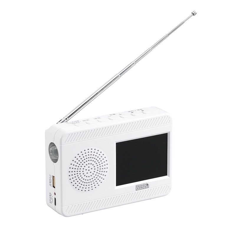 非常時に便利な機能搭載の3.2インチディスプレイ採用のワンセグ対応TV。 4Way電源(手回し、USB、AC、乾電池)で、緊急時も安心です。 機能: (1)ワンセグTV (2)AM/FMラジオ(ワイドFM対応) (3) 携帯電話充電機能(iPhone/スマートフォン対応可) (4)LEDライト 電源:リチウムイオン電池DC3.7V 2000mAh※ ※交換不可 ※単3電池×4本(別売) 充電方法: (1)手回し (2)USB (3)AC (4)乾電池 付属品: (1)ACアダプタ×1 (2)本体充電用USBケーブル(USB Type-C、USB Type-A) (3)カナル式ステレオイヤホン ※約1分間100回転での連続使用時間目安/TV:約3分、ラジオ:約10分稼働。 ※スマートフォン、携帯電話の充電ケーブルは付属していません ※一部未対応機種あり ●色柄:ホワイト ●商品サイズ:約140×97×40mm ●材質:ABS樹脂 モニターの発色により実物と異なる場合があります。