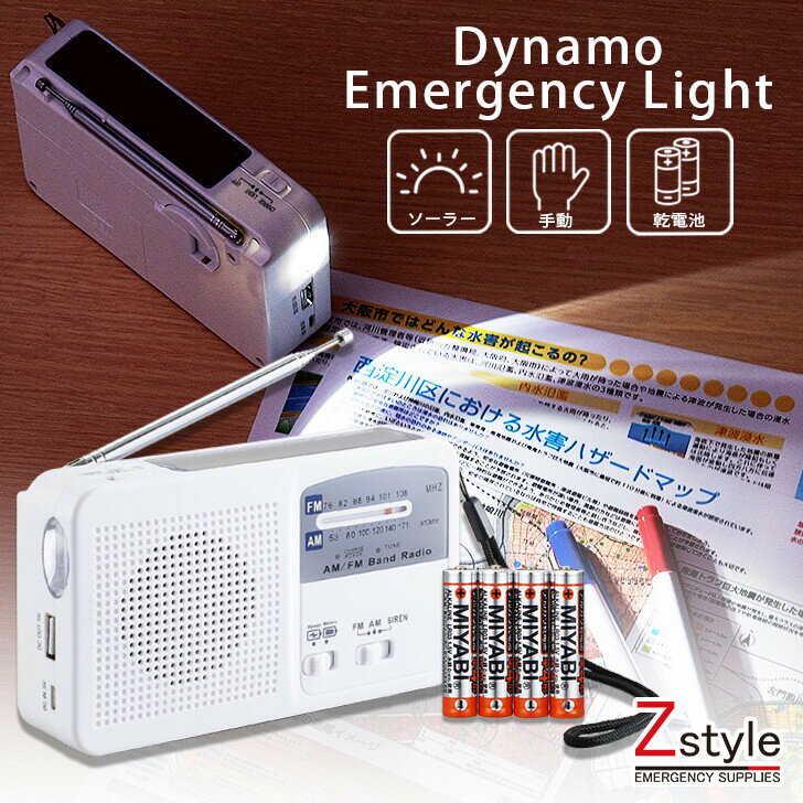 商品情報商品名ダイナモエマージェンシーライト(3電源・4機能)パッケージ サイズ5.5×15.5×9cm本体サイズ約3.6×14×8cm材質ABS樹脂セット内容ダイナモエマージェンシーライト本体アタッチメント(Type C)接続コード(MicroUSBコード)単四乾電池×4本(電池のパッケージ、メーカーは在庫状況により変更となる場合がございます。)機能情報取得・照明・通信・救難】の4役をこなせるダイナモエマージェンシーライト。災害での停電時に必ず役立つ強い味方です。<ソーラー充電機能>約10時間直射日光を照射すると満充電になります。災害時やアウトドアでも役立ちます。晴天であれば安定して蓄電可能しんどい思いをしてハンドルを回す必要もなく、乾電池が無いときにも充電可能な機能です。<乾電池の使用>乾電池をセットして使用すれば、ハンドルを回す手間やソーラー充電のように長時間充電する必要なく、スマートフォン・携帯電話への充電が可能な他、ライト機能・ラジオ機能もすぐに使用可能!※ラジオライト本体への蓄電はできません。乾電池の備蓄が無い時や、夜間や悪天候時でソーラー充電ができない時に便利な機能です。<iphoneの充電対応>※iphoneへの充電は、お手元のApple純正の充電用接続ケーブルを使用してください。その他内蔵バッテリー&乾電池が併用できます。どうしても保管したまま年数を経過してしまう防災用品。いざという時に蓄電が不十分でも乾電池対応なのですぐに使用可能!消耗品である内蔵電池が、経年劣化により使えなくなっても、乾電池が使えるので長い年月使用して頂けます。2