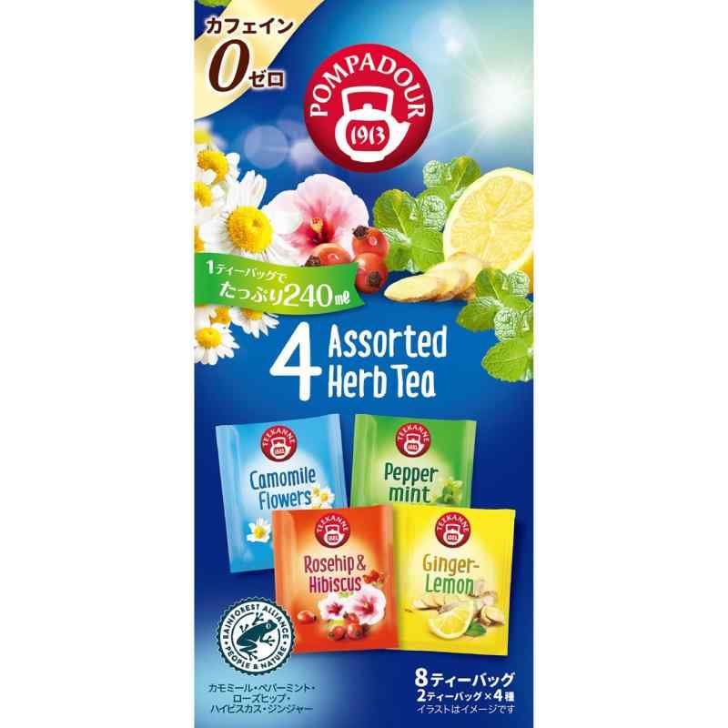 日本緑茶センター ポンパドール 4アソート ハーブティー 8袋原材料:<カモミールフラワー>カモミールジャーマンフラワー、<ペパーミント>ペパーミントリーフ、<ローズヒップ&ハイビスカス>ローズヒップ、ハイビスカス、<ジンジャー&レモン>ジンジャー、レモングラス、レモンピール、リコリス、レモンマートル