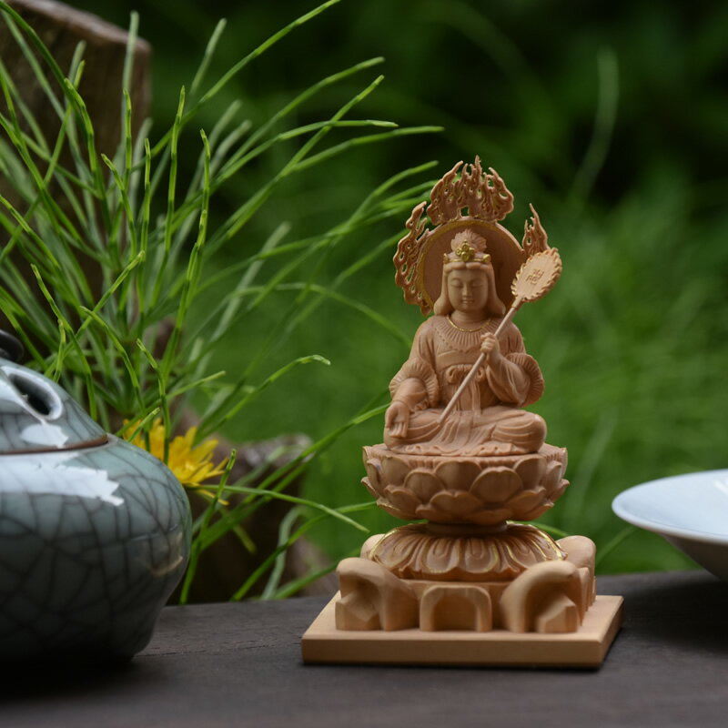 木彫り仏像 干支(卯年)お守り本尊 【文殊菩薩】 柘植 飛天光背八角台 坐2.0寸 総高22.5cm