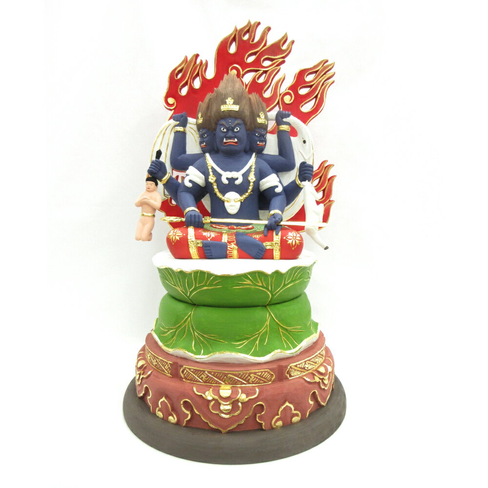 【材質:桧木】 【総高55cm、幅30cm、奥行き30cm】 三面大黒天 大自在天の化身にして、伊舎那天の化身。 この天は顕教の説では愛楽の相を表し、福徳施与の神とする。密教の説では悪魔を降伏する忿怒身をし、戦闘の神とする。忿怒形は三面六臂にして、皮膚ことごとく青黒色。蛇をもって臂釧となし、髑髏をもって瓔珞とする。火焔髪、三目にして、左右第三手で象皮を背に覆う。右第一手は剣を取り、左第一手で握る。右第二手には餓鬼の頭髪を握り、左第二手は羊の両角を引っさげる。 顕教とは仏の内証を具象化したもの。つまり、仏の心を文字や図等で人の感覚に分かるように解説したこと。