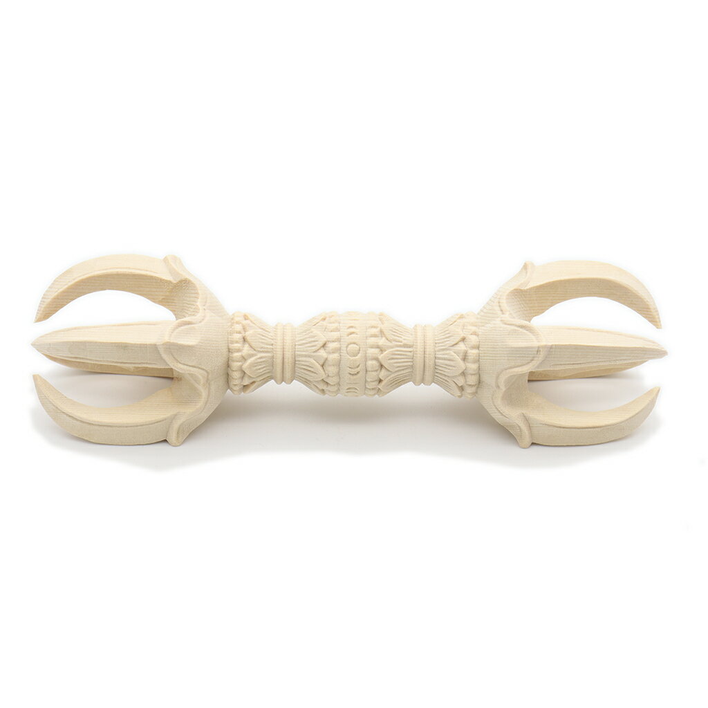 【材質:桧木】 【長さ約18cm、最大幅約4cm】五鈷杵 五鈷杵は入唐八家のうち、慧運を除く七人が日本に伝えたとされている。 本来、インドにおいては武器の一種(ヴァジュラ)であったが、密教においては諸尊の三昧耶形である。 五鈷杵のひょう幟は種々あるが、菩薩心、五仏五智、十波羅蜜の義を表し、十種の煩悩を破し、十地を証すると説かれる。