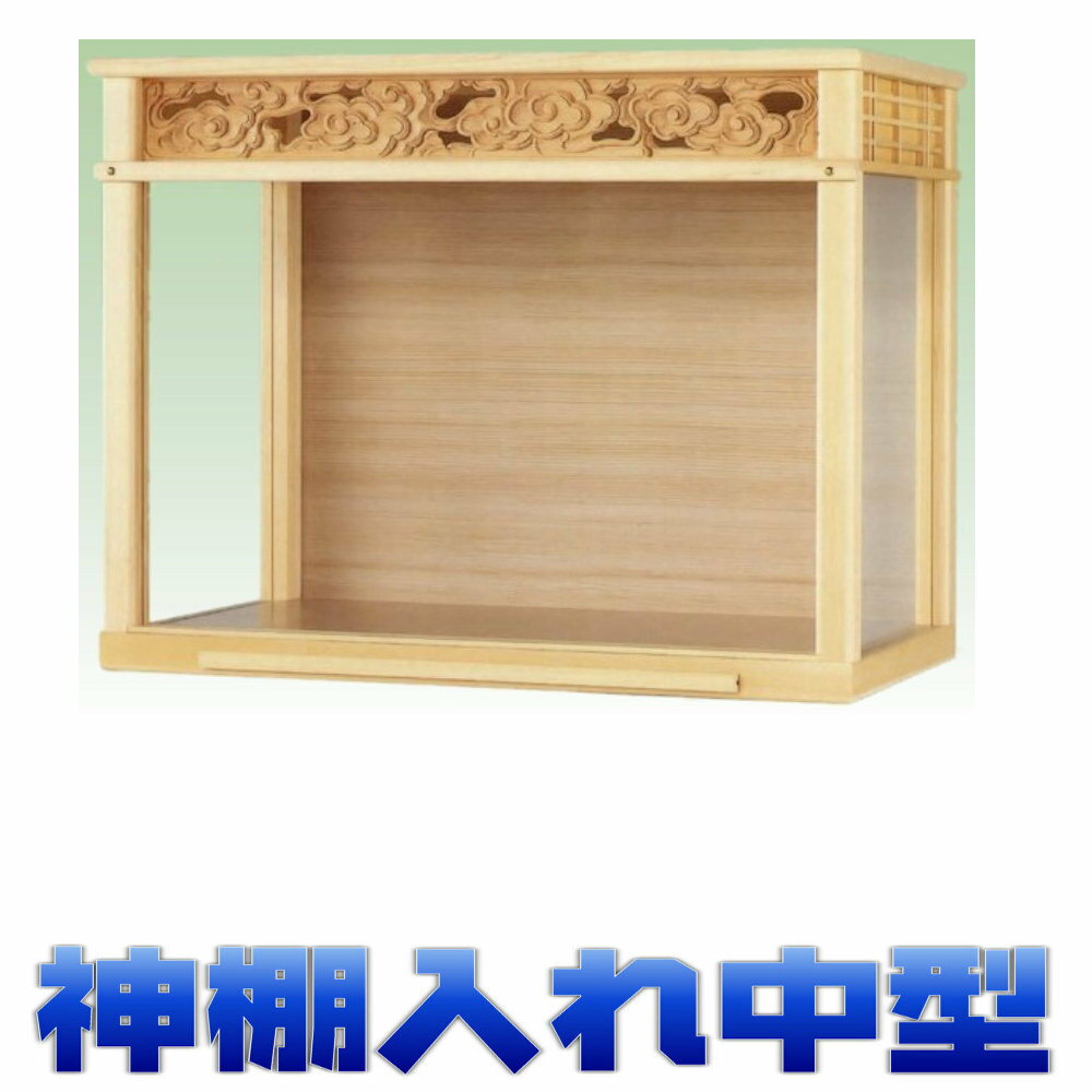 神棚 中型サイズ用 神棚ケース 吊り金具付き 神棚入れ 無料付属(木彫り雲 桧製) 壁掛け可能 ガラスケース おまかせ工房