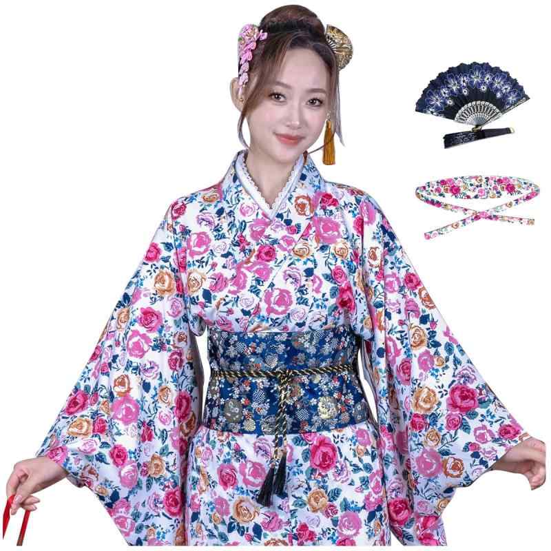 [Lkbilswei] 浴衣 レディース 浴衣セット すべすべ シフォン yukata 同じ柄 簡易な 結び帯 扇子 3点セット 花柄 カメリア キキョウ ベゴニア 薔薇 浴衣 女性用 コスチューム 旅館浴衣 ゆかた 大人【素材】---- 肌にやさしく、薄く、すべすべのシフォン素材を採用し、着心地も最高の女性浴衣を着て夏のイベントで楽しんでいただきます;浴衣の品質やイメージなどこだわり抜きました。【色と柄】ーー花柄 (カメリア キキョウ ベゴニア 薔薇)可愛い花柄浴衣セットになります。 誰でも簡単に着ることが可能です。浴衣の柄は今流行りの現代的なレトロモダンの柄でワンランク上のオシャレを楽しめます。 花火大会や街歩き、盆踊りなど、夏のお出かけにたくさんご活用ください。 【特色】 ーー丁寧に作られたさらりと心地良いポリエステル素材です。 袖口、裾、脇にはにはダブルステッチでほつれにくく仕上げてあり、強度が強いのが特徴です。【セット内容】花柄浴衣+扇子+同柄・同素材の結び帯の3点セットです。結び帯が届いてすぐに使えます。はじめから柔らかい肌触りですが、使用前に一度水洗いしていただくことを推奨しております。【サイズ(cm) 】身丈(背から):約144cm、袖丈:約46; 結び帯全長:245cm; 適用身長:155cm―170cm;(150以下なら、浴衣を少し折りて着用する方がよい) 【お手入れについて】洗濯機でお洗濯可能です。堅牢度の高い機械染めですが、白ものとは分けて洗ってください。【用途】--- 夏祭りや七夕祭り、もちろん夕涼みに散歩、文化祭等イベントにもどんな時も活躍してくれます。親子・姉妹・友達など同柄でお揃いしたり、色違いでお揃いしたり、この夏の思い出を残してみませんか。 こっそり誕生日祝いや母の日・敬老の日などプレゼントにも~