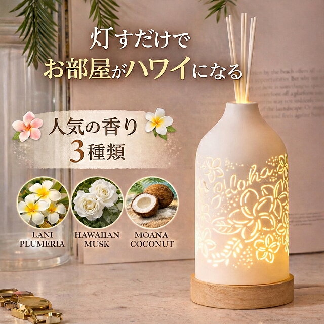 高級感のあるデザインで、セラミック容器のディフューザーです♪台座部分が点灯し、ハワイの風景が柔らかな光でうかびあがります。 リビング・ベッドルーム・玄関など、優しいハワイアンアロマに包まれて、最高の癒し空間に☆ サイズ:縦 16.5cm 横 9cm容量 :100ml シェード:陶器/ボトル:プラ/ボトルキャップと内蓋:アルミ/リード:紙/ボトム:木/LEDライト・コンセント 液体/水 アルコール 香料 芳香期間: 香り持続時間 約1.5〜2ヶ月【ハワイアン雑貨】【ハワイアン 雑貨】【ハワイ 雑貨】【ホヌ】【モンステラ】【プルメリア】