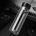 ウォーターボトル 水筒 クリア ガラス 二重構造 マグボトル 直飲み ボトル すいとう 茶漉し付き 透明 蓋付き 漏れなし 給水ボトル 保冷 保温 グラス 耐熱ガラス製 お茶入れ ビジネス メンズ 男女兼用 (ブラック,350ml)